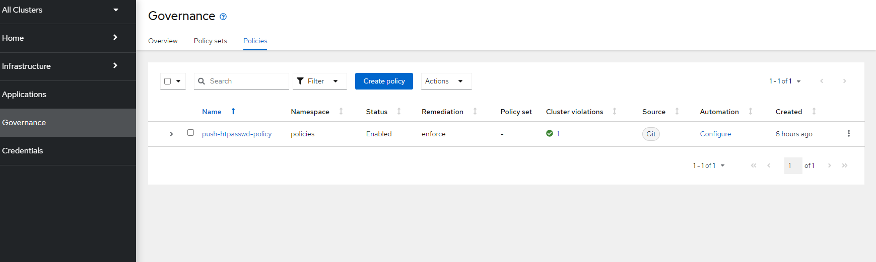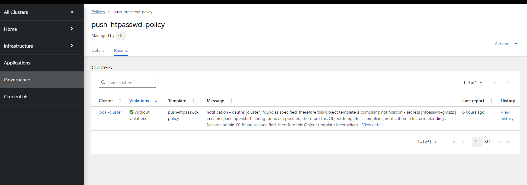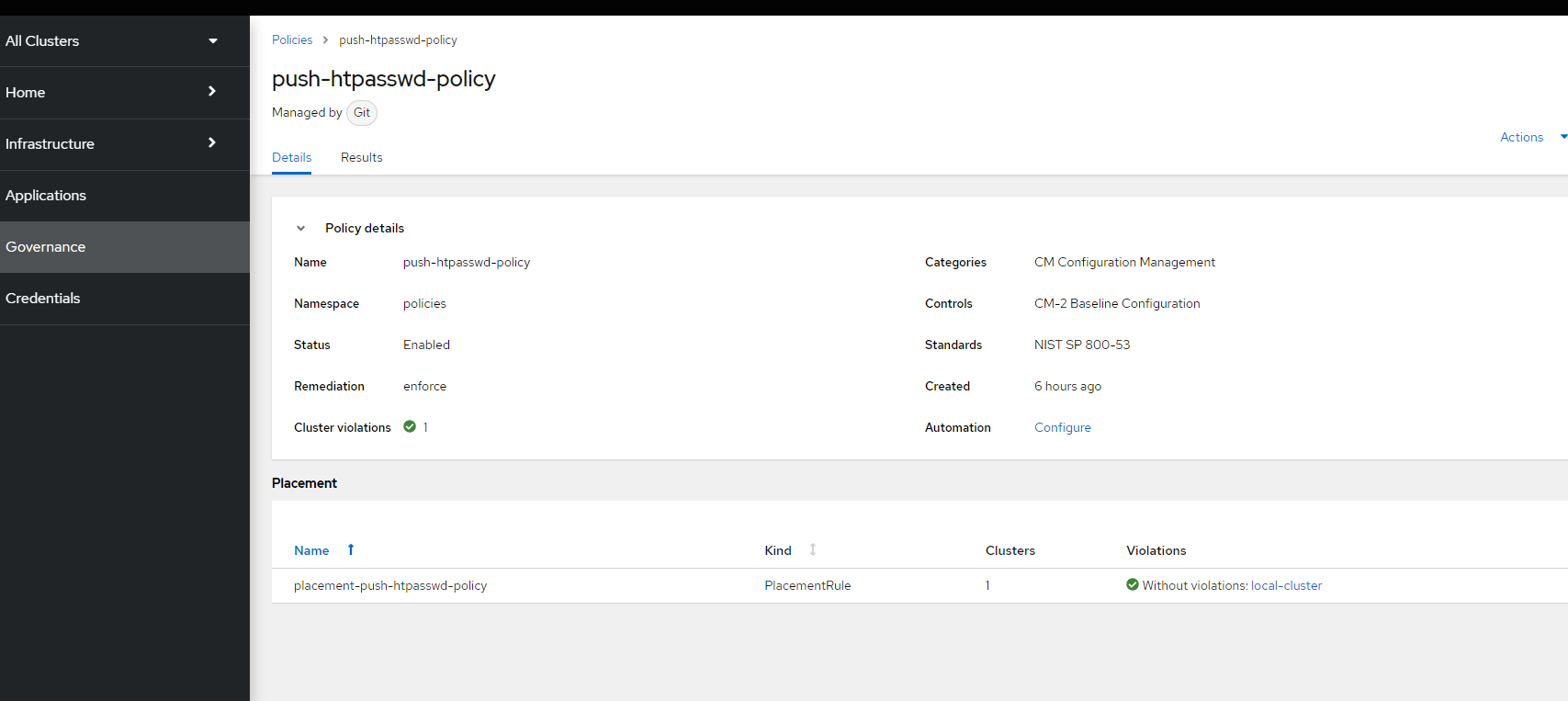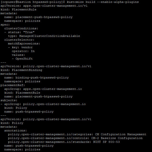 - path: htpasswd-combined.yamlThis takes the htpasswd-combined YAML file and adds a clusterSelector (vendor: OpenShift) and a remediation action of enforce to the resulting policy.