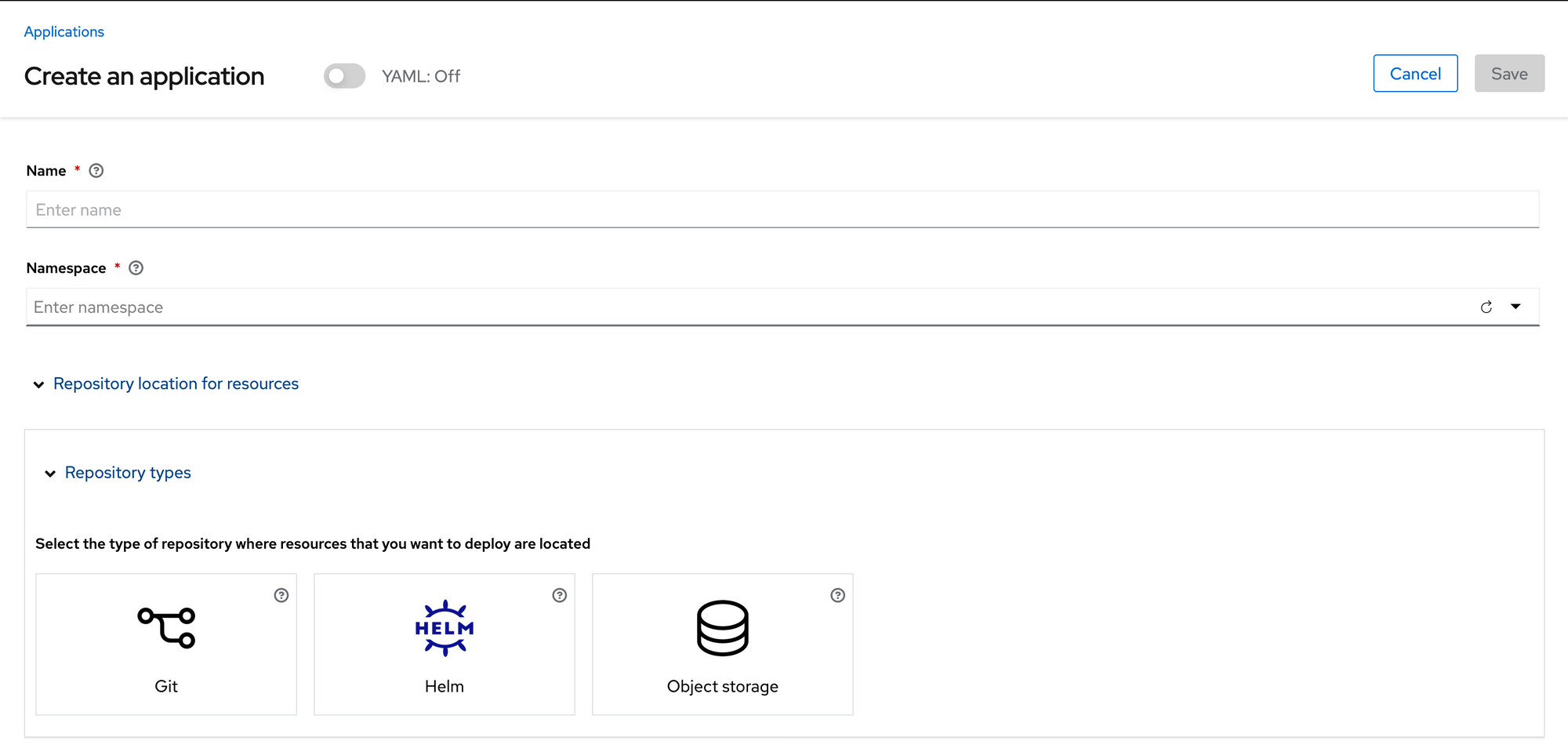 After clicking the "Create Application" button in the upper-right hand corner, a wizard screen will appear.