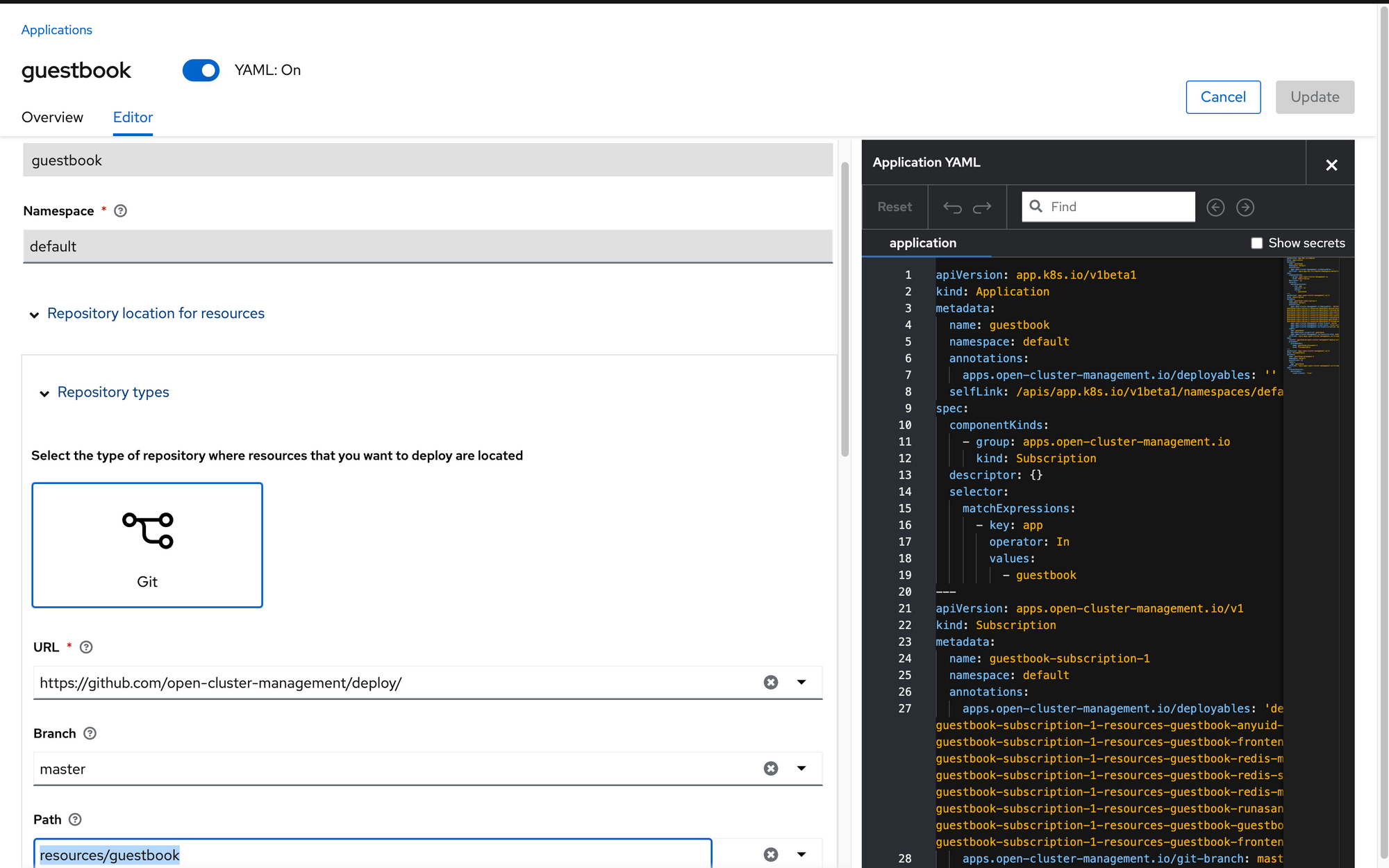 For example purposes, we are going to use a Git repo for our source. The Git repo is located at https://github.com/open-cluster-management/ and a guestbook app will be deployed. This GIT repo is just a collection of OCP/Kubernetes object definitions that get consumed and deployed as an application in ACM.