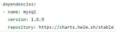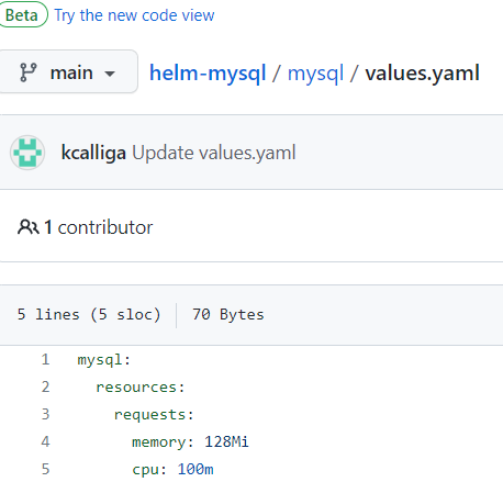 First, Mysql will be deployed by specifying the Helm repo and chart. This method is based off a tar.gz (tgz) file which is contained on a webserver (see https://helm.sh/docs/topics/chart_repository/). Within that tgz file are default deployment settings (values.yaml) that will get applied.