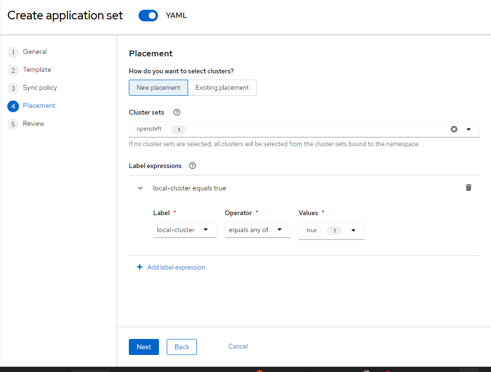 Select New Placement --> ClusterSet (Openshift)