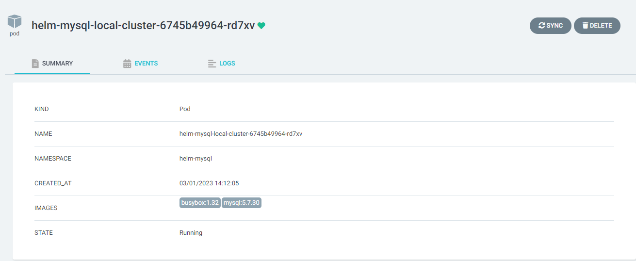 7. Click on the "Pod". In the top screen there is high-level summary information including events and logs.