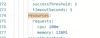In the bottom screen is the live YAML of the running pod. If we search this output for the resource.requests memory, we will see that is using the 128Mi value which was defined in the Git repo (not using the default Helm.sh repo value)