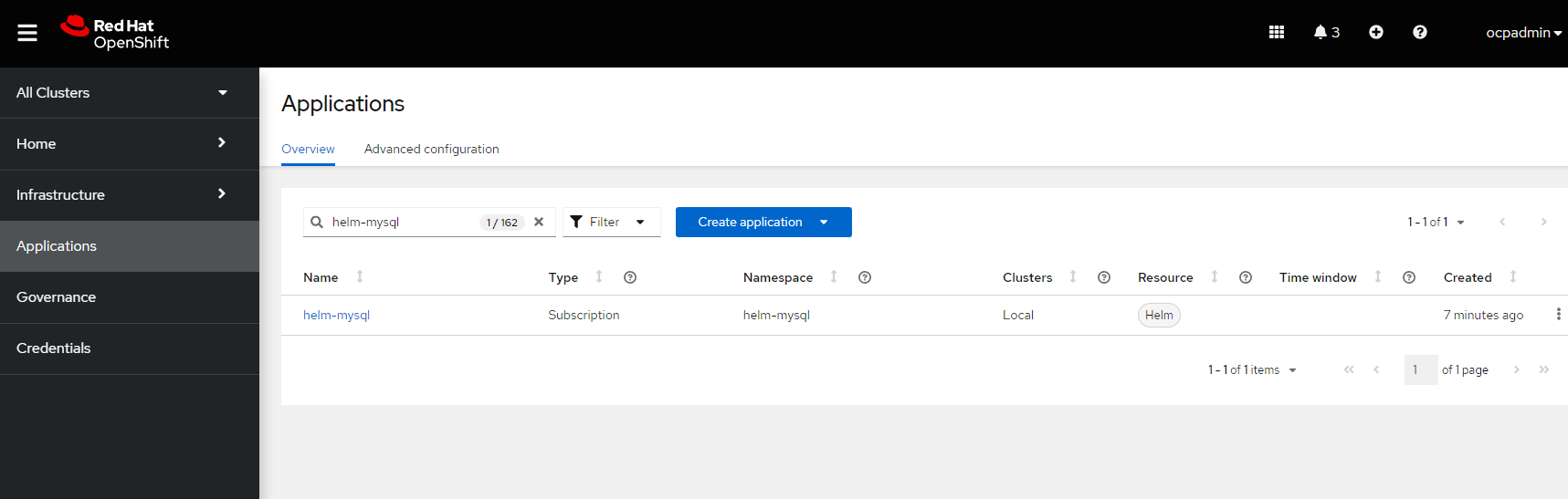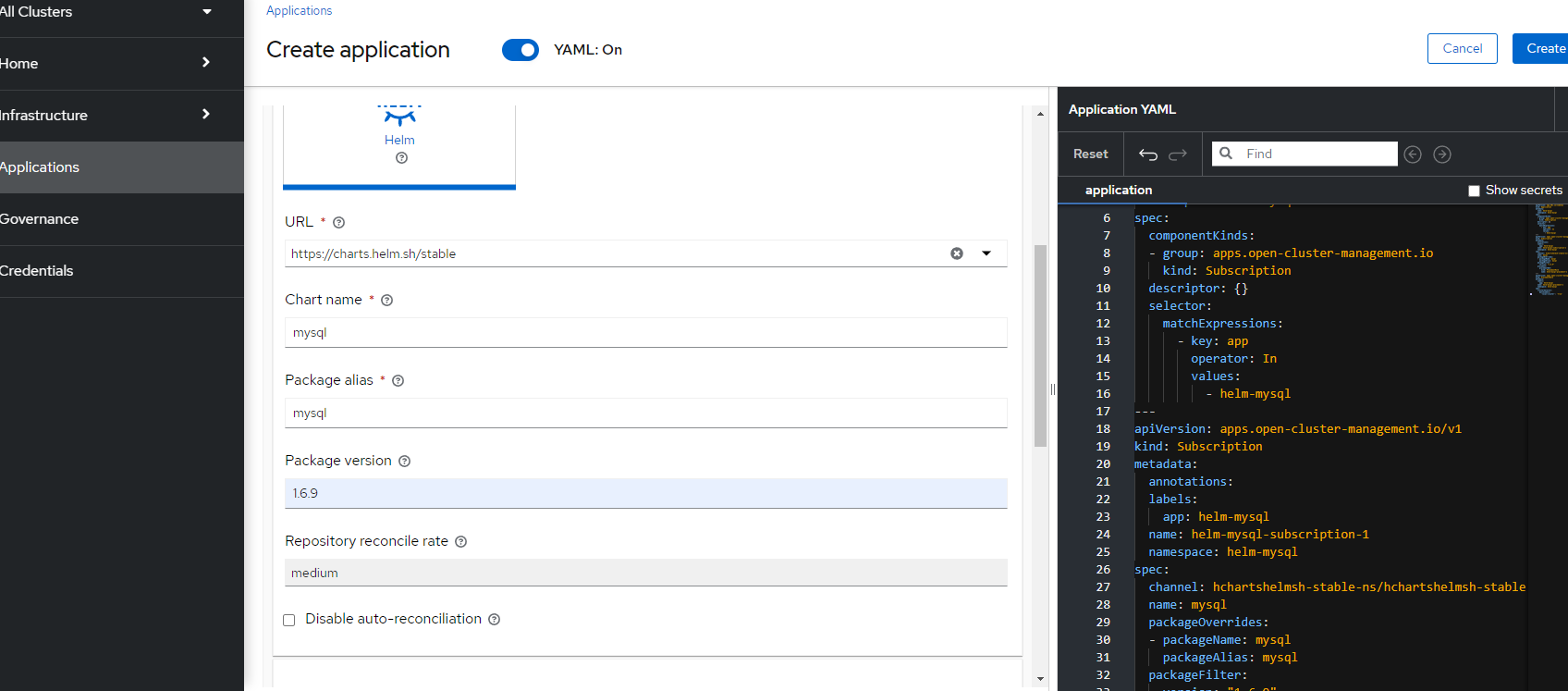 - Create a helm-mysql project/namespace on the hub cluster.