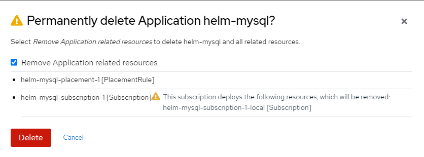 7. Let's clean-up . Go back to main Applications menu and search for "helm-mysql". Click the 3 dots on the right-side of screen and choose "Delete Application". Check the box to remove all application resources.