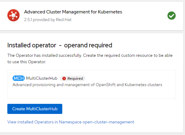 6. Wait for MultiClusterHub to be in an installed state.