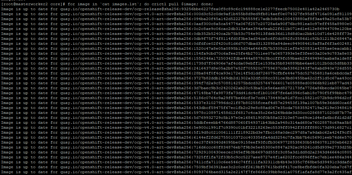for image in `cat images.lst`; do crictl pull $image; done;In some cases, the images will already exist. A message saying that "image is up to date" may be displayed.