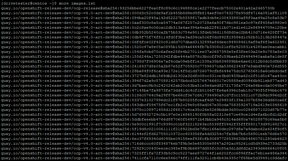 cat release.txt |grep openshift-release-dev|grep quay.io|awk '{print $2}'|grep -v From > images.lstIn this release.txt is list of the 141 images/digests that make up the OCP install.