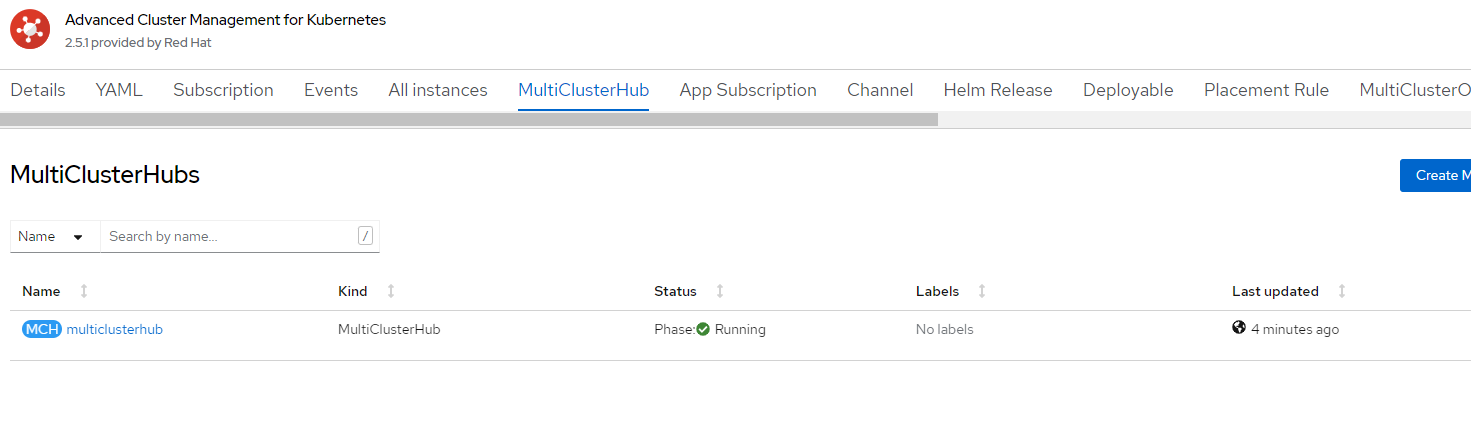 5. Once ACM Operator is installed, let's create the MultiClusterHub. Use all the default options at this point.