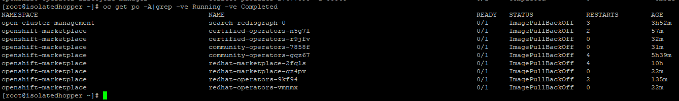 oc get po -A|grep -ve Running -ve CompletedNow, we will go onto the next steps of preparing the environment to be isolated.