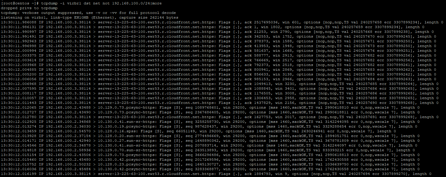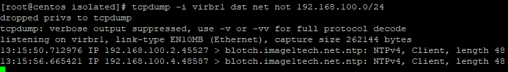 tcpdump -i virbr1 dst net not 192.168.100.0/24I ran this command before I rebooted the nodes just to be sure I am getting some output. See the NTP traffic going out below. In my environment, NTP is going out to the Internet. You'll want some type of NTP internal on your routers/switches, etc.