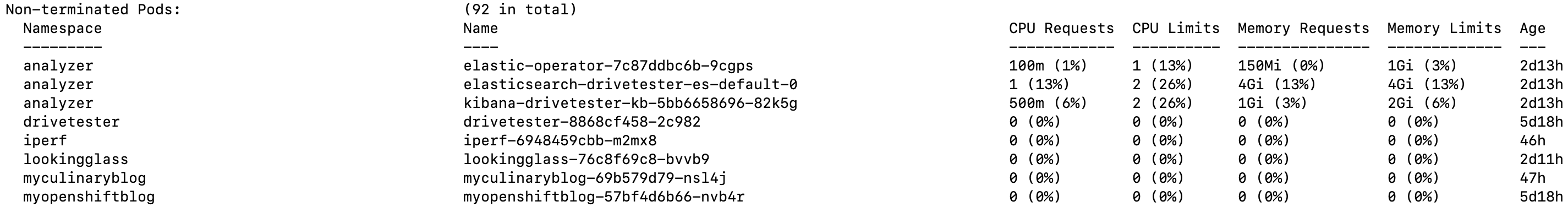 This output shows the pods that are running on the node and lists the cpu/memory request/limit information.
