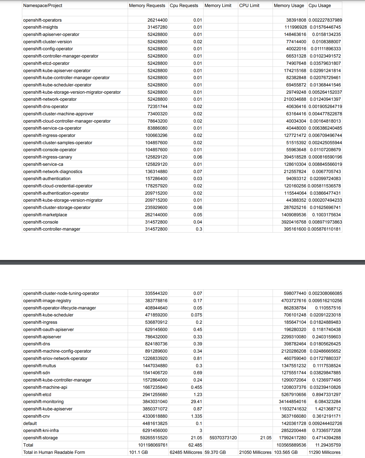 There are no limits set on a majority of the Openshift namespaces/projects. I have a feeling this is by design (but I could be wrong) because we don't want any of these workloads to fail for any reason. Given that this is the case, we may want to go based on current utilization and add subtract limits that are set (to make available resources lower). ODF is the only limit that is set at 21050 millicores and 59.370 GB of memory. This number will be added.