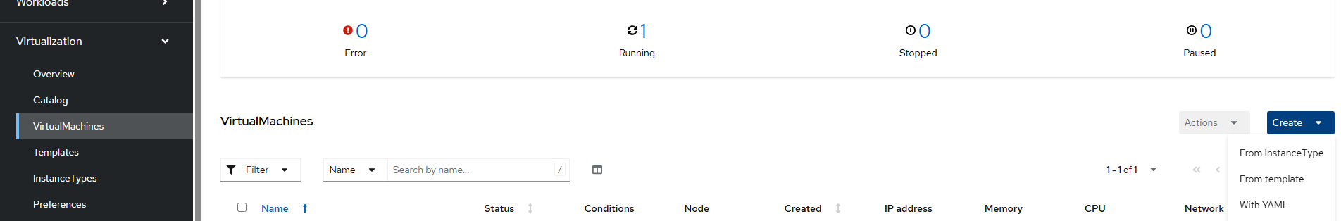 - Go to Virtualization --> Virtual Machines from the Virt web console.