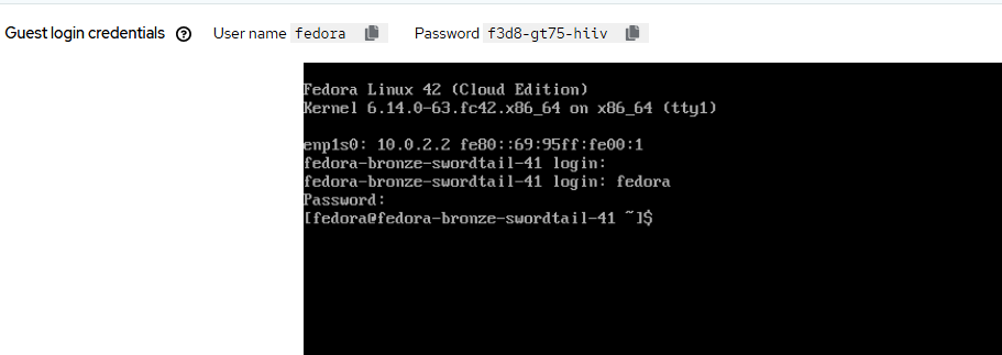 - Once it is deployed and running, go to the "Open web console" link right underneath of "VNC console". Login with the credentials that are shown at the top (generated by cloud-init).