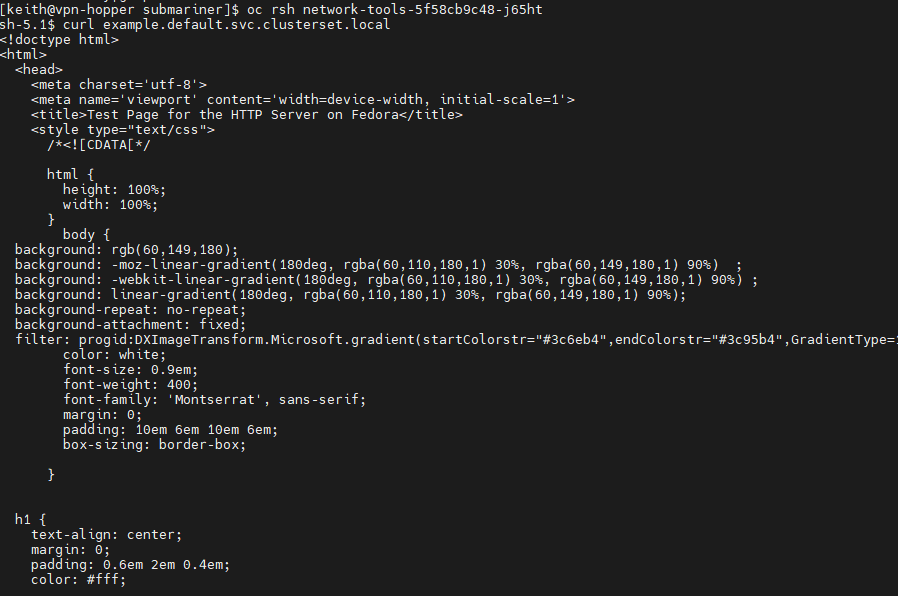 To verify connectivity from the hub cluster to port 80 on this VM running on Virt cluster, we will deploy a network test pod.