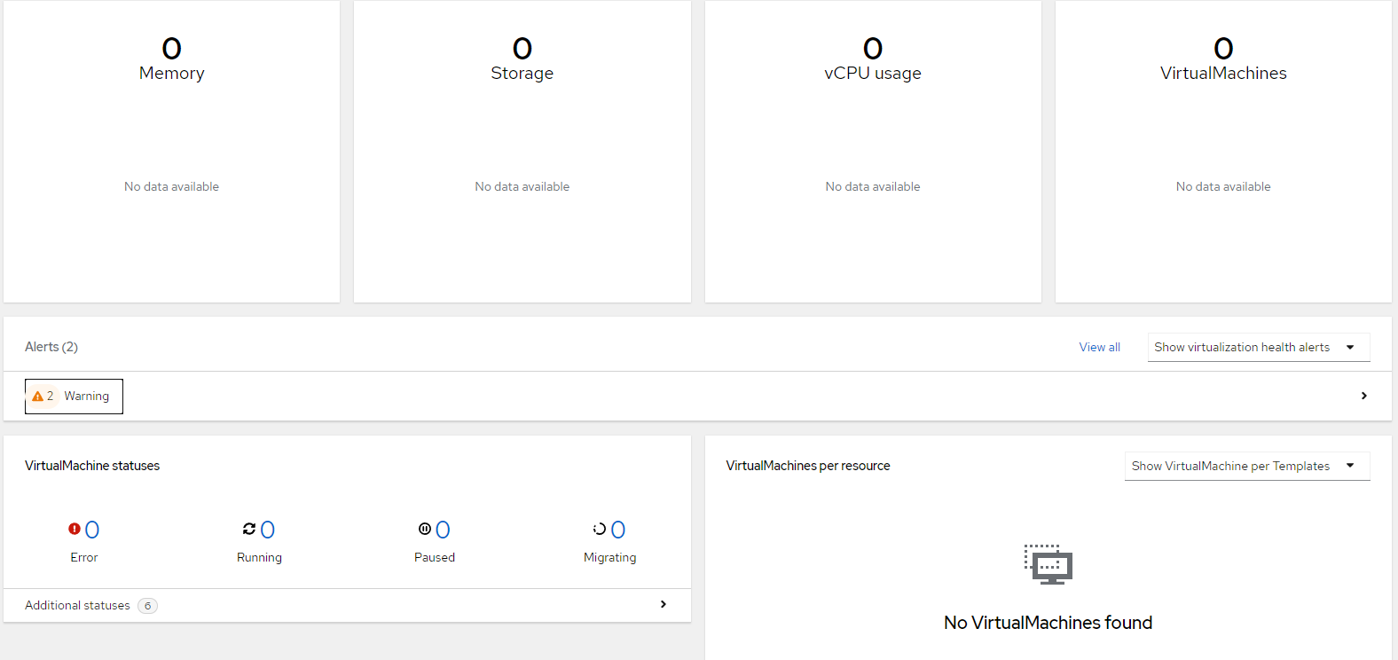 The Overview screen provides "getting started" resources and information from a cluster-wide level in regards to resource utilization by Openshift Virtualization. In addition the main screen shows alerts and virtual machine statuses across the cluster. Lastly, there is a section that shows a breakdown of the virtual machines by resource/template. Nothing shows in this screenshot yet since this is a new instance.