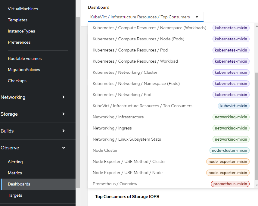 Observe --> Dashboards --> Kubevirt/Infrastructure Resources/Top Consumers