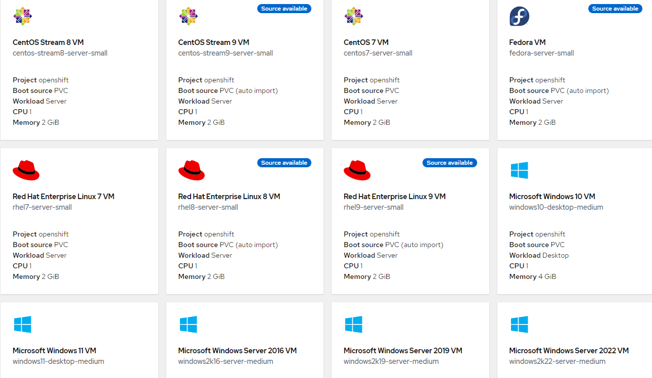 Openshift Virtualization comes pre-populated with templates based on Centos Stream 8/9, Fedora, RHEL 7/8/9, and Windows 10/11 and 2016-2022 server variants.