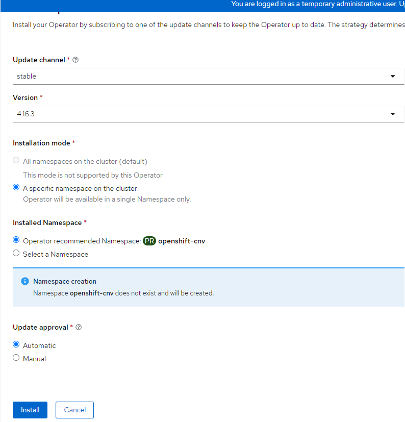 - On the next screen, accept the defaults which will include creating a namespace called openshift-cnv and automatic updates to the operator. Click "Install"