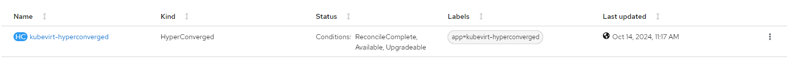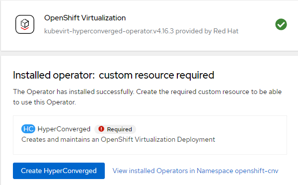 - On the resulting screen, an option will show to "Create HyperConverged". This is the default CR that enables the base functionality of Openshift Virtualization and is necessary for all of this to work. Click "Create HyperConverged".