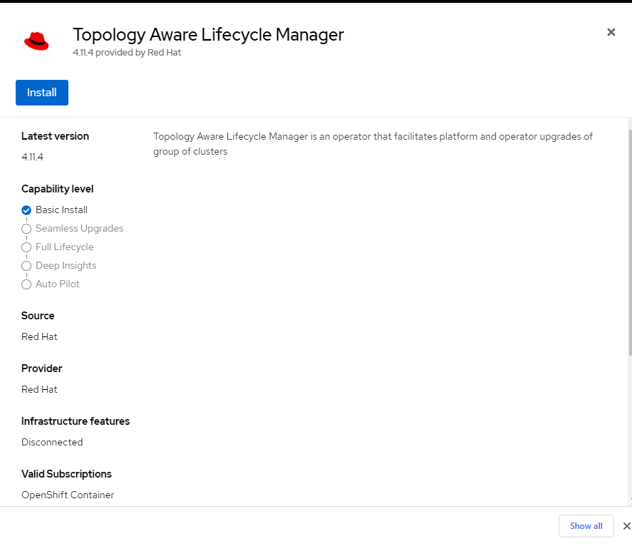 - Search for GitOps and click on the "Topology Aware Lifecycle Manager" which is provided by Red Hat