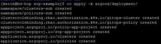The deployment directory contains YAML files that will be applied to enable Openshift Gitops/ArgoCD to manage the entire lifecycle of clusters including the applications and policies (using policygentemplates) that get pushed to the resulting cluster.