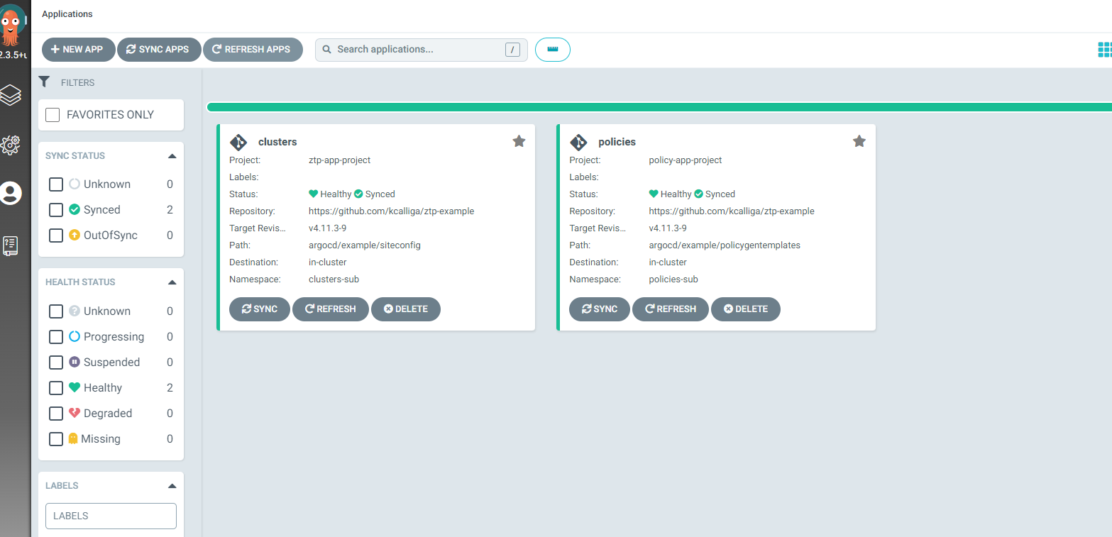 The clusters-apps is the Gitops application that handles the synching of Siteconfigs.