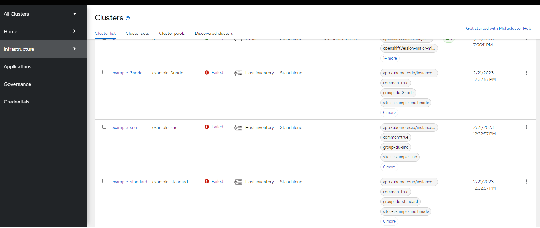 oc create namespace $CLUSTERNS7. Since some of these objects already exist based on the defaults in the GitRepo, you may see some cluster deployments in failed state in the ACM GUI as shown below. Don't worry, we will make changes to the GitHub repo to get rid of the example-3node and example-standard. The example-sno will be modified shortly.