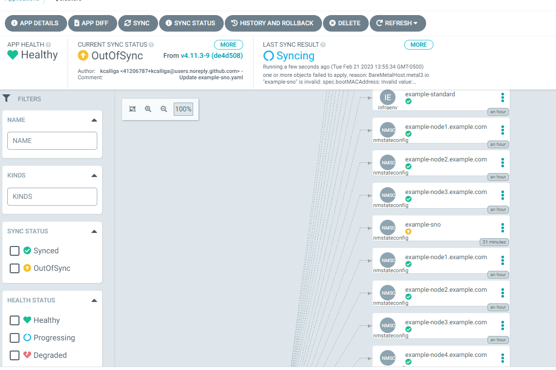 Within this box, on the right-side, you will see that example-sno nmstateconfig is in an out-of-sync state.