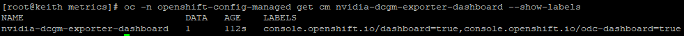 oc -n openshift-config-managed get cm nvidia-dcgm-exporter-dashboard --show-labelsThe output to the last command will look as follows:
