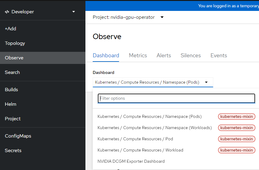 For the Developer perspective, go to Observe --> nvidia-gpu-operator namespace –> Dashboard --> Nvidia DCGM Exporter Dashboard