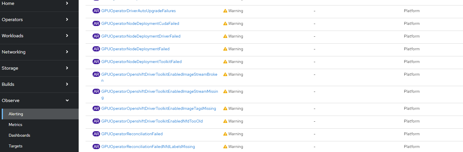 There are a few alerts that come with the GPU operator. These are shown below: