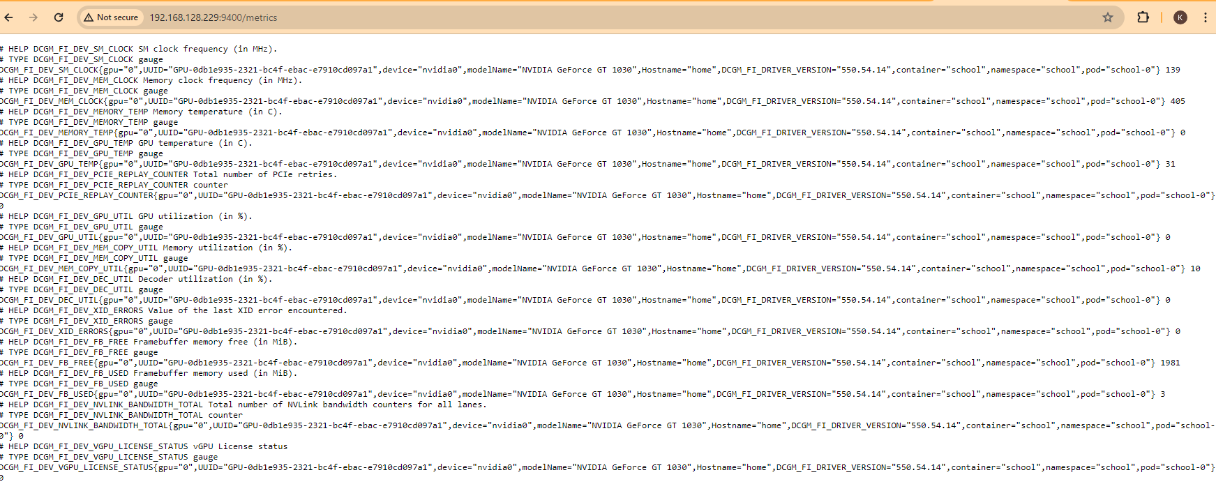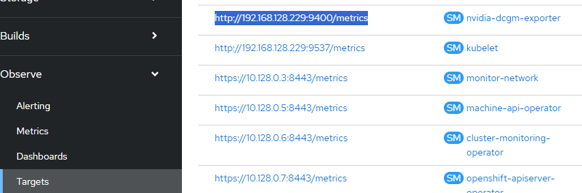 - Go to Observe --> Targets and search for the nvidia-dcgm-exporter ServiceMonitor CRD. It will be exposed through a NodePort on one of your OCP nodes. In this case, my endpoint is http://192.168.128.229:9400/metrics