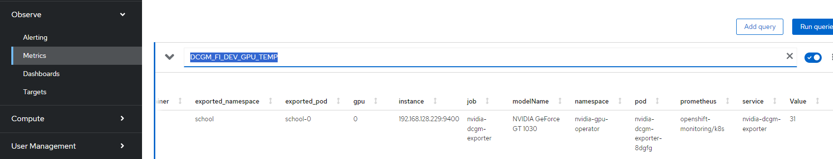 To see this information on the Openshift Web Console, go to Observe --> Metrics and run a query on DCGM_FI_DEV_GPU_TEMP as shown below (current value is 31 degrees Celsius):