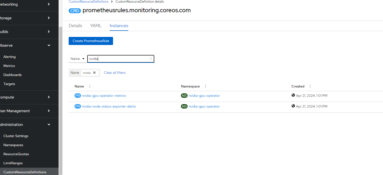- Go to Instances and search for nvidia. You will see two PrometheusRule CRDs