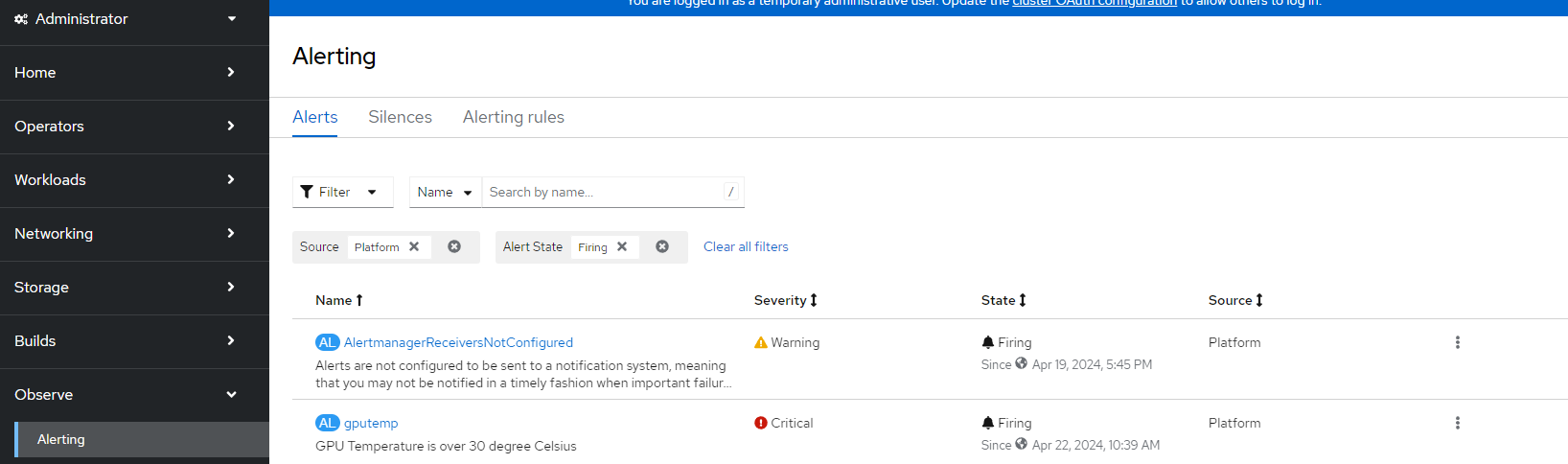 oc apply -f gpu_alertmanager.yamlWithin a few minutes, this alert should show up in the Openshift Console under Observe --> Alerting as shown below.