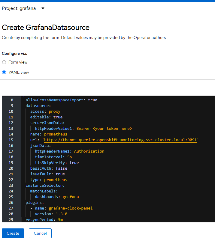 - Back in the Opensift Web Console, let's create a Grafana Datasource resource. Click "Create Grafana Dashboard". Go to YAML view and copy/paste this code: