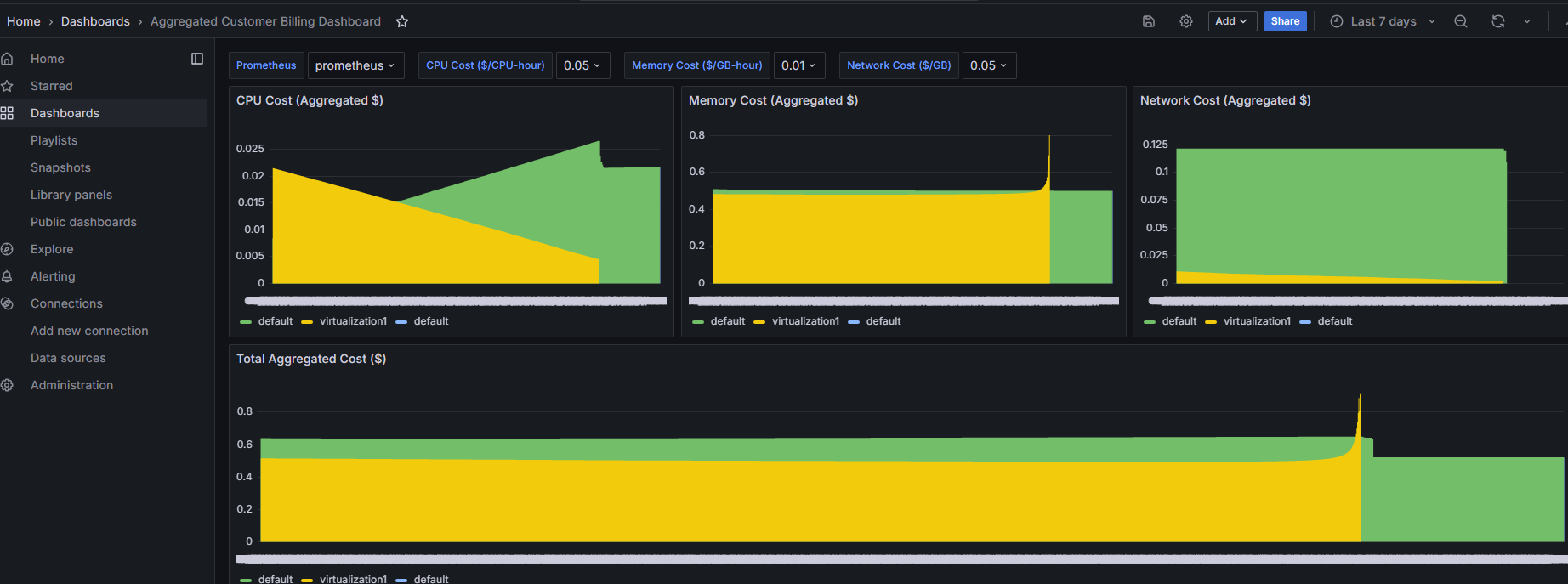 "(sum by (namespace)( increase(kubevirt_vmi_cpu_usage_seconds_total[$__range]) ) / 3600 * $cpuCost)\n+ on(namespace) group_left()\n(sum by (namespace)( avg_over_time(kubevirt_vmi_memory_used_bytes[$__range]) ) * $__range_s / 3600 / (1024*1024*1024) * $memoryCost)\n+ on(namespace) group_left()\n(\n (\n sum by (namespace)( increase(kubevirt_vmi_network_receive_bytes_total[$__range]) )\n + sum by (namespace)( increase(kubevirt_vmi_network_transmit_bytes_total[$__range]) )\n ) / (1024*1024*1024) * $networkCost"This gives you an idea on what you can do on your own but it is probably a lot easier to use our Cost Management Metrics Operator. Another blog on this will be posted shortly.