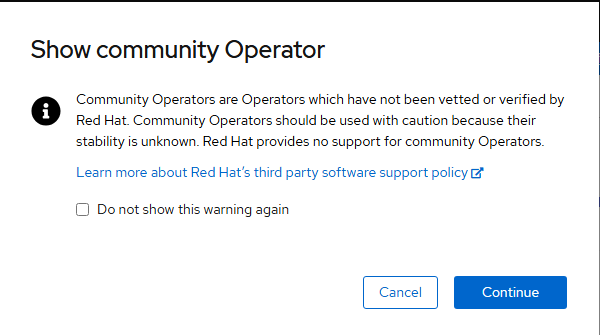 A warning message will appear as informational message indicating that this operator has not been vetted or tested by Red Hat. You can hit "Continue".