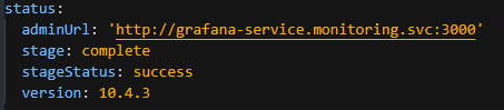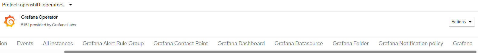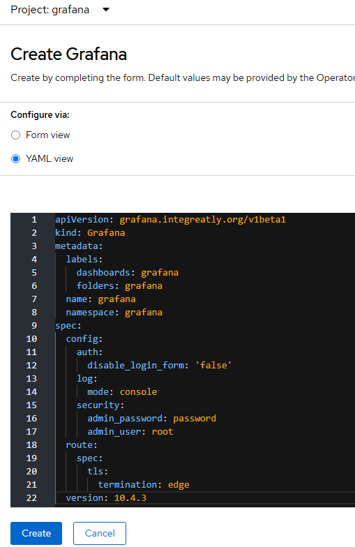 - Create an instance of Grafana CRD. You may need to use the scroll-bar at top of the window and go all the way to the right.