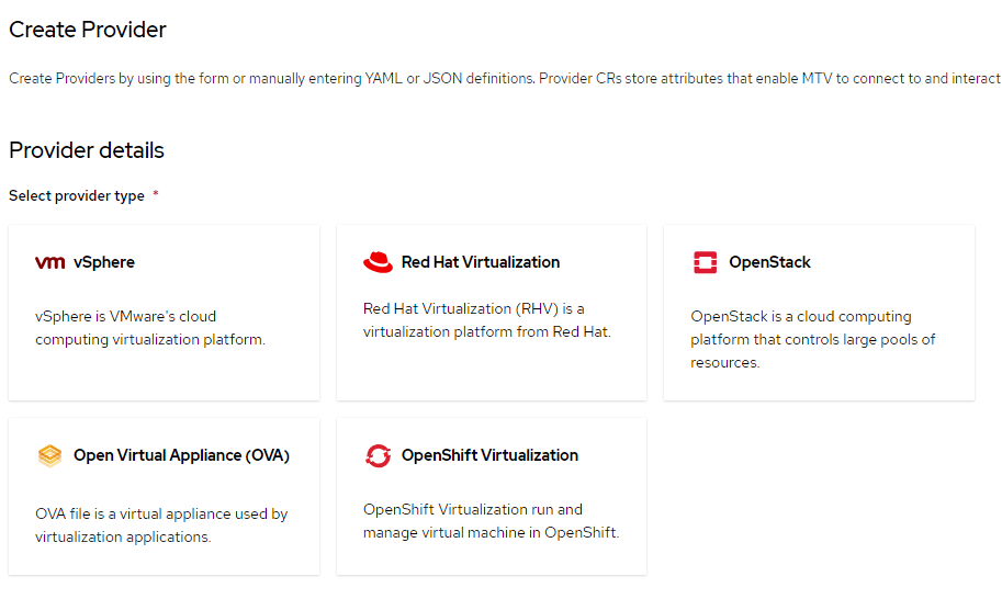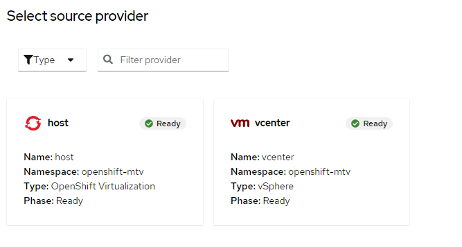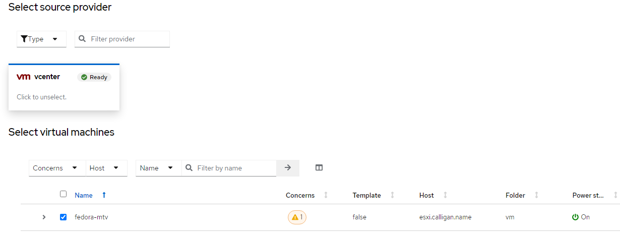 - On the resulting page, two options will be available for source provider. The original one called "host" and the Vcenter one we just added.