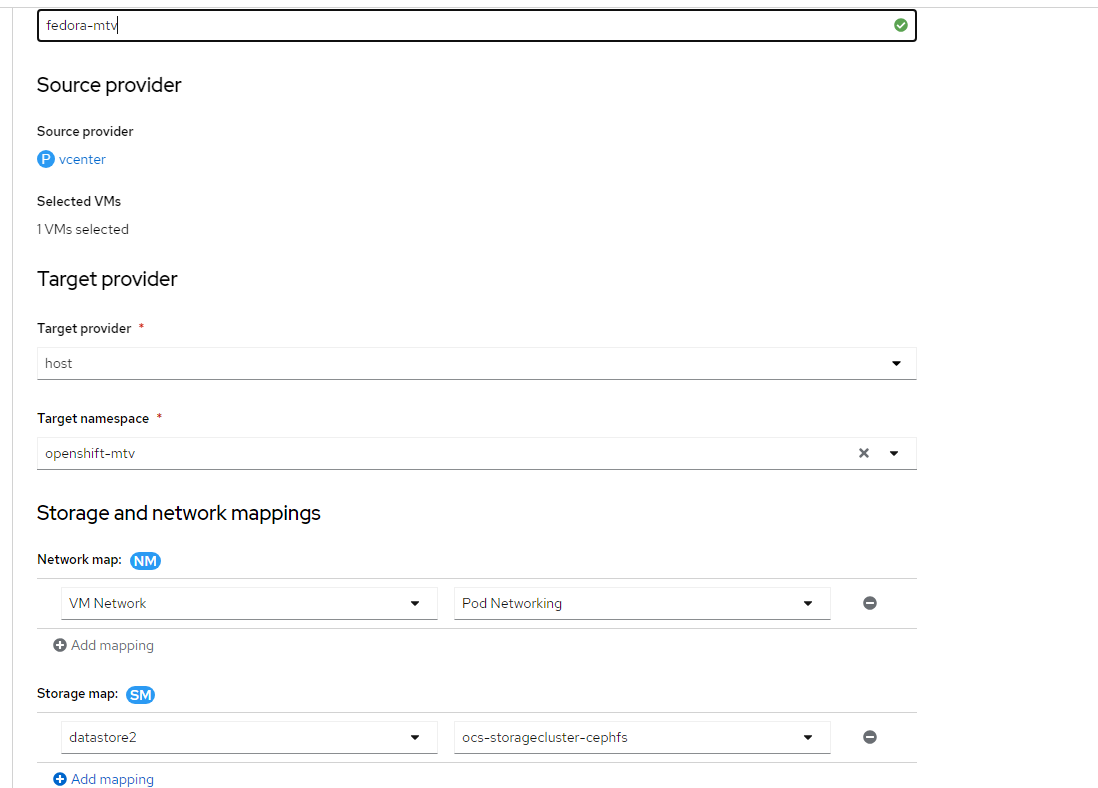 - On the next page, provide a name for the VM. It is called "fedora-mtv" in this example. The source provider is vcenter and it is going to the host provider (which is openshift virtualization on this cluster). All of the other defaults will be used for this simple example.