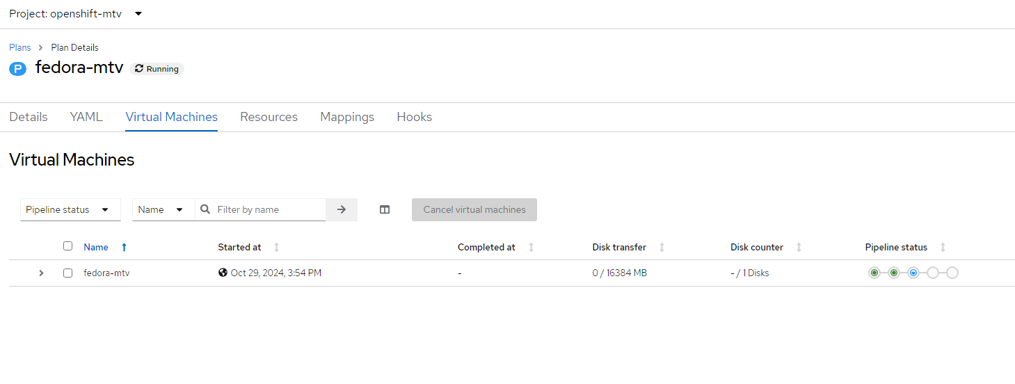 - Next, I will select the virtual machine in my environment called fedora-mtv.
