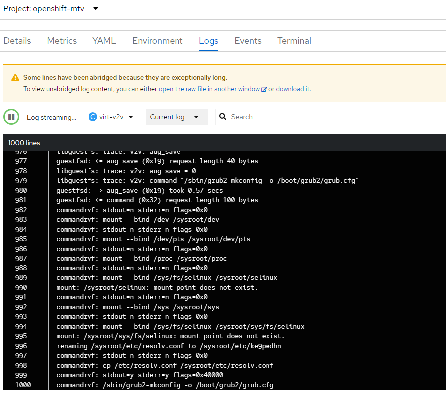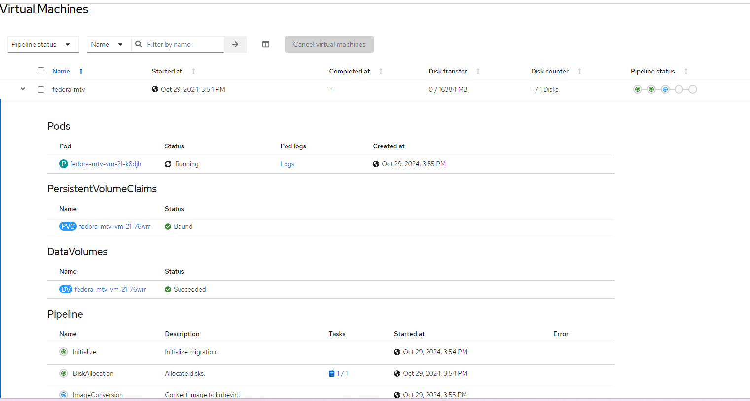Also, by clicking the arrow next to the fedora-mtv object on the Virtual Machine menu will show you the associated pod that is performing the migration (fedora-mtv-vm-21-k8djh) and the associate persistent volumes, etc.
