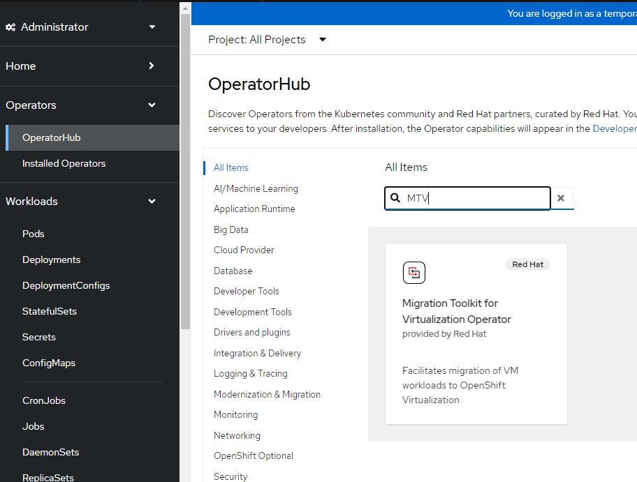 - In the Openshift Web Console, go to Operators --> OperatorHub and search for "MTV".