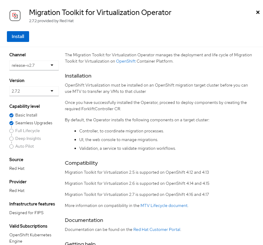 - Accept the default install options. As of this writing, the MTV operator is at version 2.7.2. Click "Install"