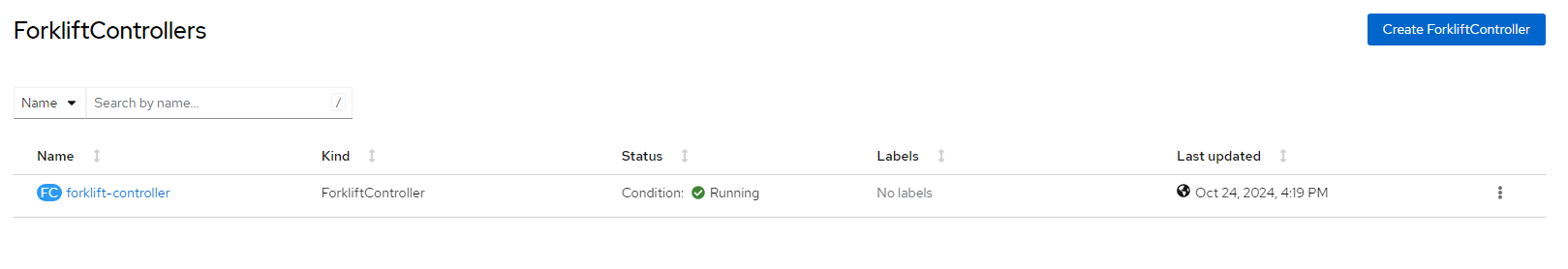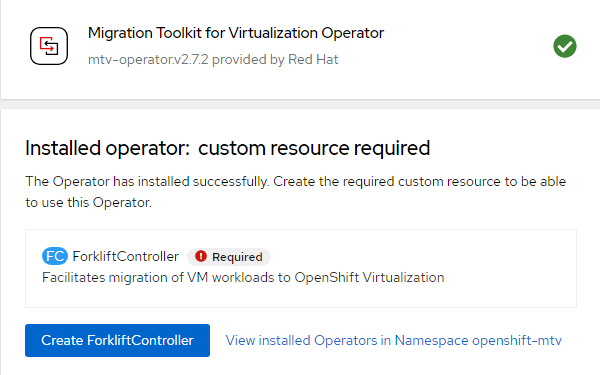 - A project/namespace called openshift-mtv will be created. The next step will be creating the Forklift controller which is the controller that handles these migrations.