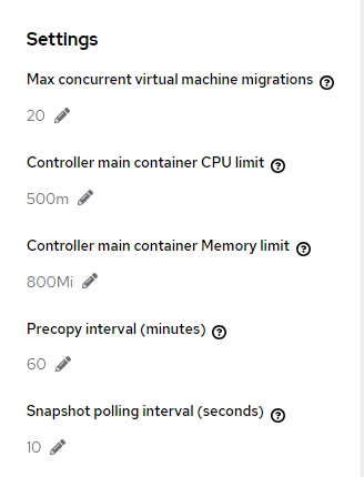 Overview: This page shows a high-level overview of the running pods in the openshift-mtv project/namespace. There is also some status information and metrics available. Lastly, there are some configuration parameters that can be modified on this page as shown in the screenshot below.
