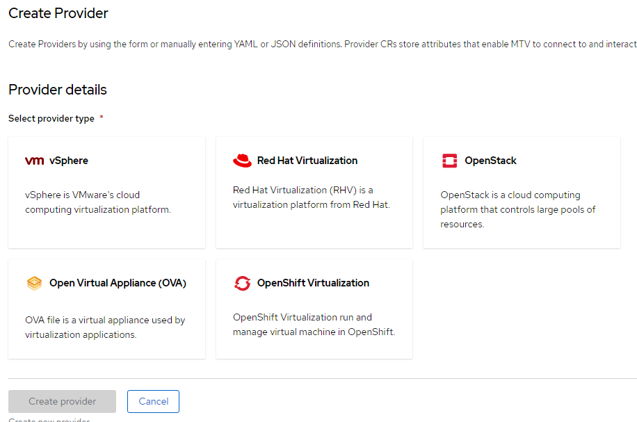I will select VM/Vsphere. Once this box is highlighted, the "Create Provider" button will illuminate. Click "Create Provider".